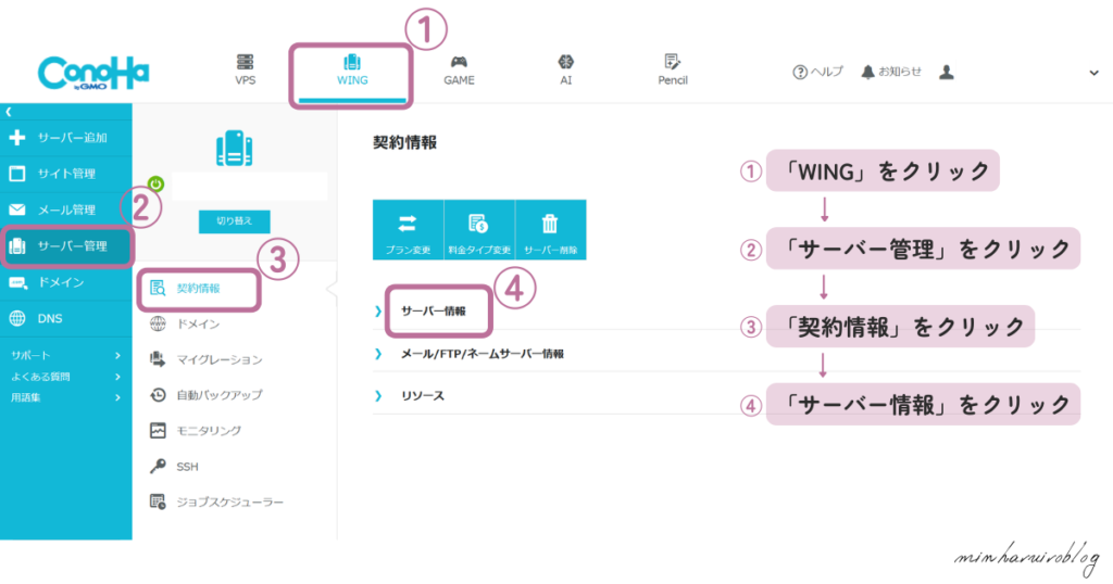 コントロールパネルにログインしたら、①「WING」→②「サーバー管理」→③「契約情報」→④「サーバー情報」の順にクリックします。