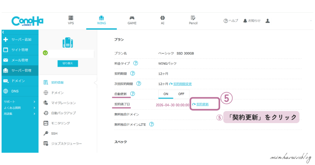 「サーバー情報」内「プラン」の箇所で、契約満了日の右横にある⑤「契約更新」ボタンをクリックします。