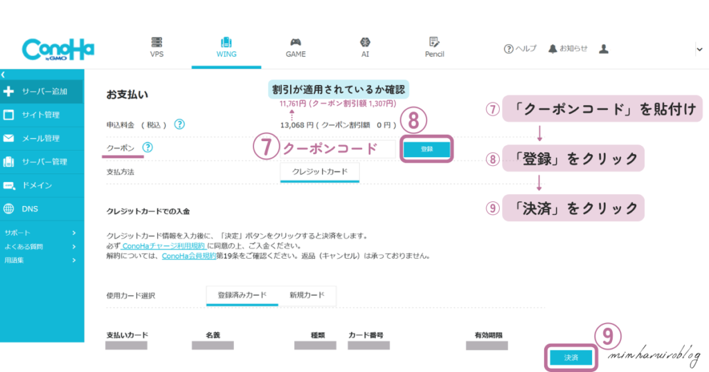 STEP1でコピーしたクーポンコードを、「お支払い」内⑦クーポンの箇所に貼付けて⑧「登録ボタン」をクリック。上部に表示される料金に、クーポン割引額が適用されているか確認後、⑨「決済」をクリックします。