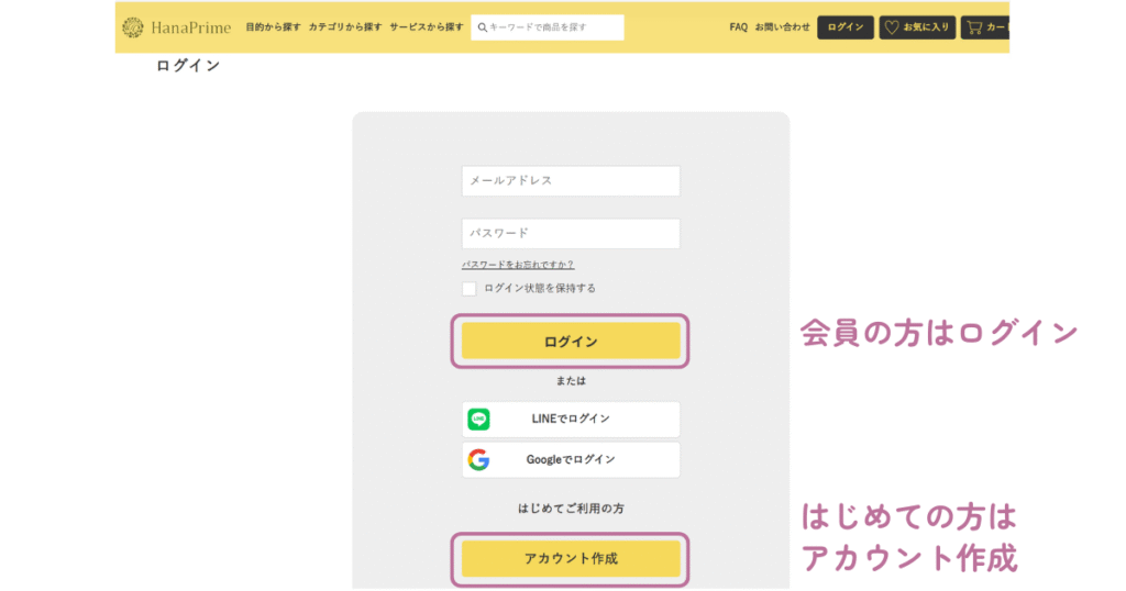 まず、HanaPrime(ハナプライム)公式サイトを開き、会員の方はログインをします。はじめての方はアカウントを作成します。「お花の定期便」ページから希望のプランを選択。お届け頻度や支払い方法を設定して申し込むだけで完了します。