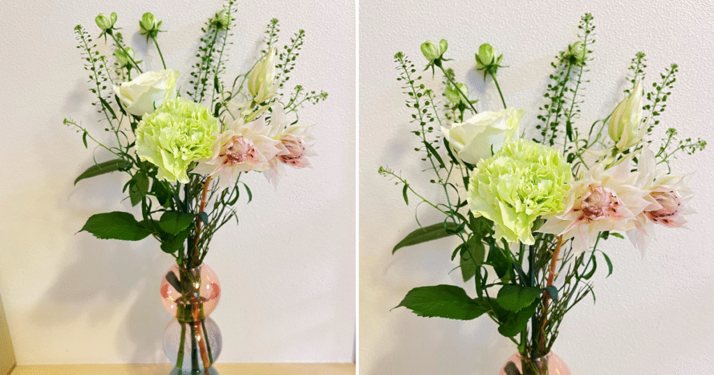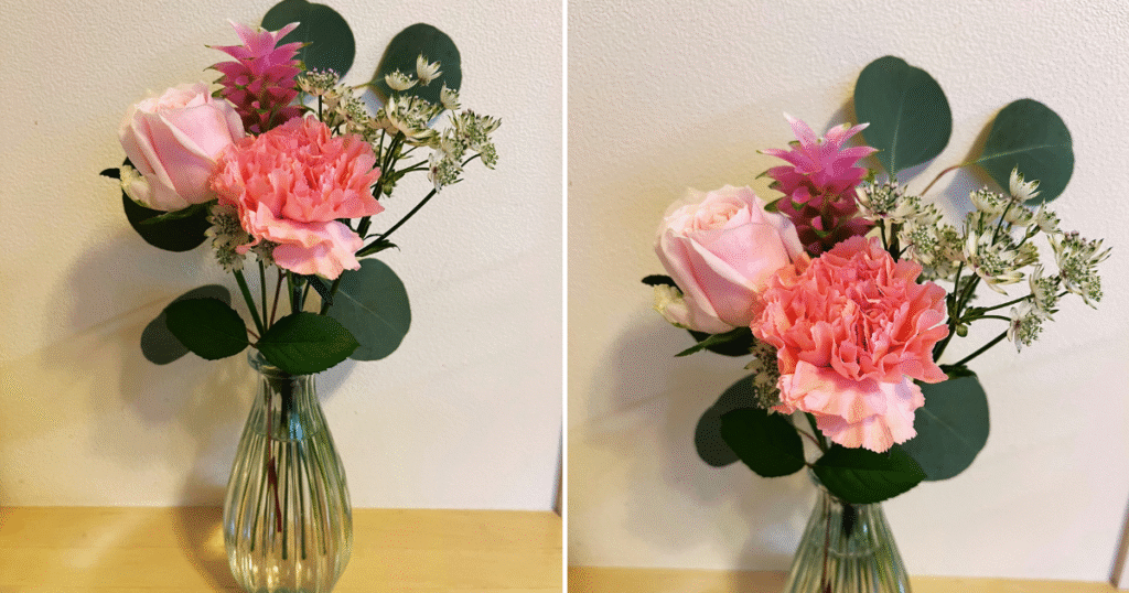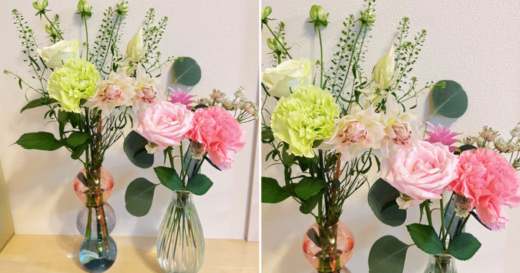 良かった点は「とにかく管理が楽」なこと。届いた状態のまま花瓶に入れるだけで完成する手軽さが魅力です。反対に、少し気になった点を挙げるとすれば、「自分で花を選べない」こと。しかし、2回ともバランスの良い組み合わせで、むしろ新しい花に出会える楽しみがありました。色合いも、初回はピンク系、2回目はグリーン系と異なるカラーが届き、その変化を楽しめて嬉しかったです。