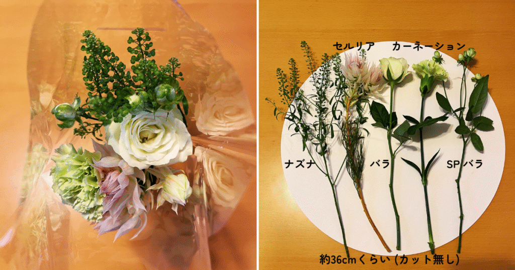 第2回目に届いたのは、グリーン系をメインにした花材5本で、花の長さは前回と同じく約36cmでした。内容は、ナズナ、セルリア、バラ、カーネーション、SPバラの5種類でした。