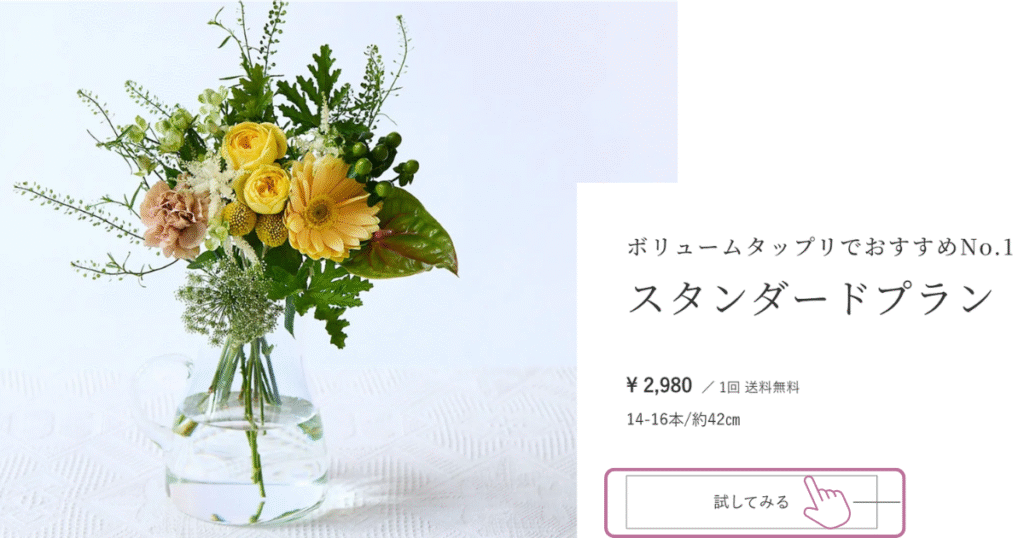 「お花の定期便」のページに表示される、4つのプランの中から希望のプランを選択し、「試してみる」をクリックします。