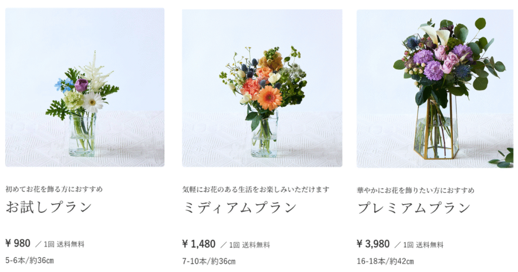 プランは4種類あり(※2025年10月現在)、飾る場所やボリュームに合わせて選べます。たとえば「お試しプラン」や「ミディアムプラン」はテーブルやデスクなど小さなスペースにぴったりです。一方、「スタンダードプラン」や「プレミアムプラン」はボリュームたっぷり、華やかにお花を飾りたい方におすすめで、リビングや玄関などに飾るのに最適です。