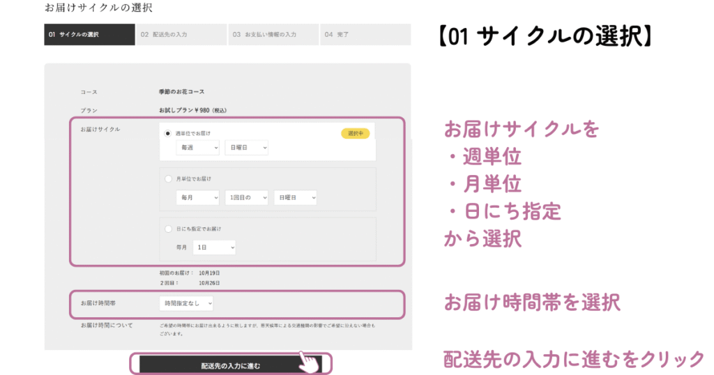 希望のプランを選択したら、まず【01 サイクルの選択】を行います。お届けサイクルとお届け時間帯を、下記の選択肢の中から指定し、「配送先の入力に進む」をクリックします。