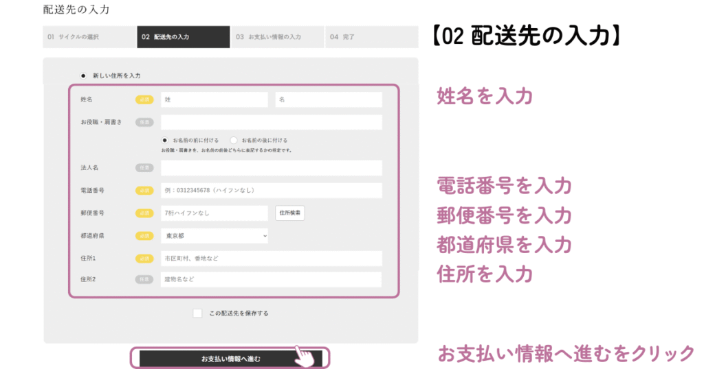 お届けサイクルとお届け時間帯を選択した後は、【02 配送先の入力】をします。姓名、電話番号、住所の入力が完了したら、「お支払い情報へ進む」をクリックします。