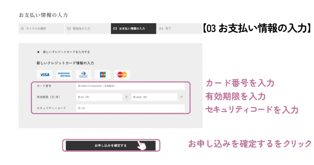 配送先の入力が完了したら、次に【03 お支払い情報の入力】に進みます。支払い方法はクレジットカードのみのため、カード情報を入力し、「お申込みを確定する」をクリックします。手続きが完了すると、【04 完了】画面が表示され、「お花の定期便」お申込み手続き完了となります。