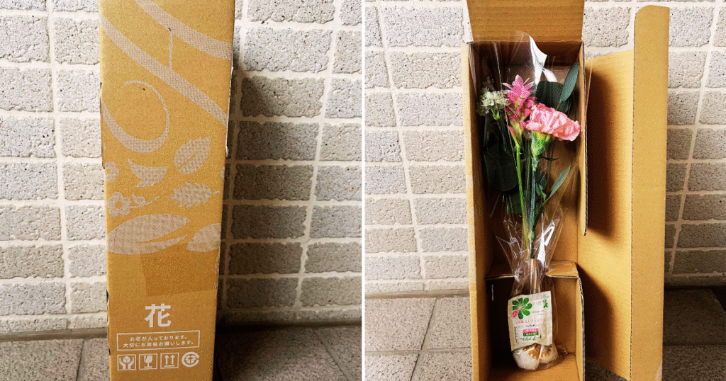 実際に届いたお花の段ボールです。箱を開けると、まず驚いたのは 梱包の丁寧さです。お花専用の段ボール箱の中にしっかりと固定されており、花びらが折れたり茎が曲がったりする心配がありません。お花の茎には保水材がしっかりと巻き付けられており、配送中もお花が痛まないように配慮されていました。切花延命剤も同封されています。