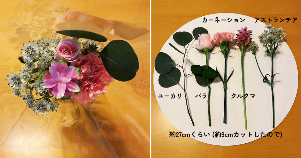 初回に届いたのは、季節の花を中心としたピンク系メインの花材5本。ホームページに記載の通り、約36cmでした。ユーカリ、バラ、カーネーション、クルクマ、アストランチアがバランスよく束ねられ、花屋で購入するよりもボリューム感が感じられました。